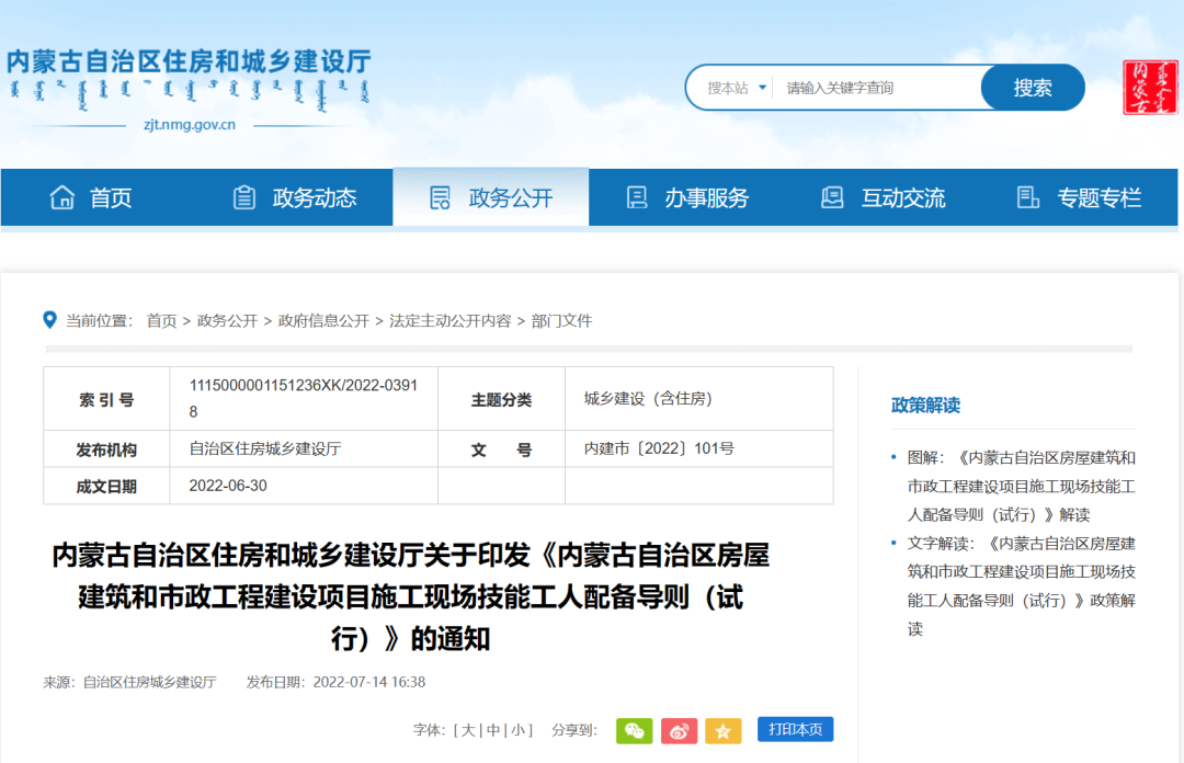 2022年6月30日,内蒙古住建厅印发《内蒙古自治区房屋建筑和市政工程建设项目施工现场技能工人配备导则(试行)》。