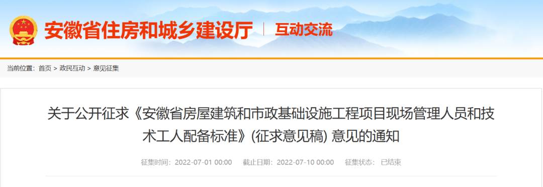 2022年6月30日,安徽省住建厅发布《安徽省房屋建筑和市政基础设施工程项目现场管理人员和技术工人配备标准》(征求意见稿)。