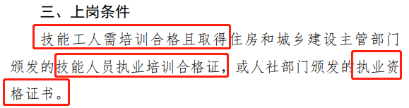 一般技术工人需取得住房和城乡建设主管部门颁发的技能人员执业培训合格证,或人社部门颁发的执业资格证书。