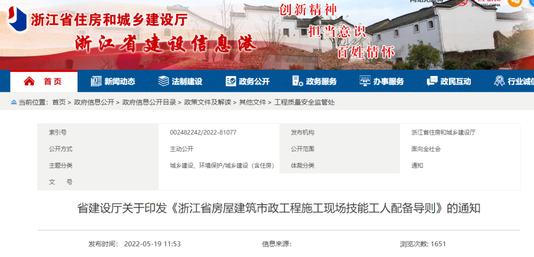 5月19日,浙江省住建厅发布关于印发《浙江省房屋建筑市政工程施工现场技能工人配备导则》的通知。