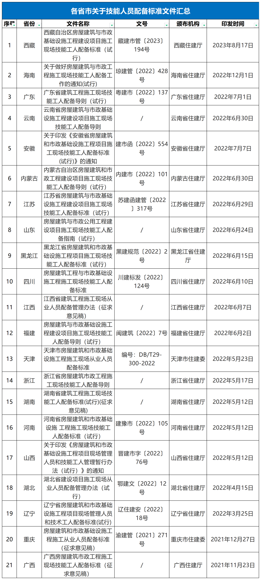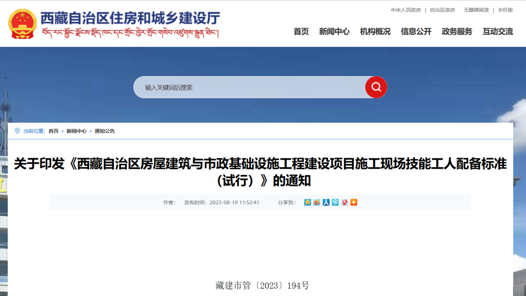 2023年8月17日,西藏自治区住建厅印发了《西藏自治区房屋建筑与市政基础设施工程建设项目施工现场技能工人配备标准(试行)》,自印发之日起实施。