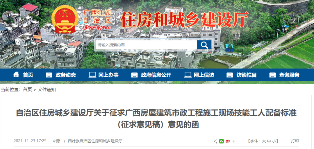 2021年11月23日,广西区住建厅发布关于征求广西房屋建筑市政工程施工现场技能工人配备标准(征求意见稿)意见的函。