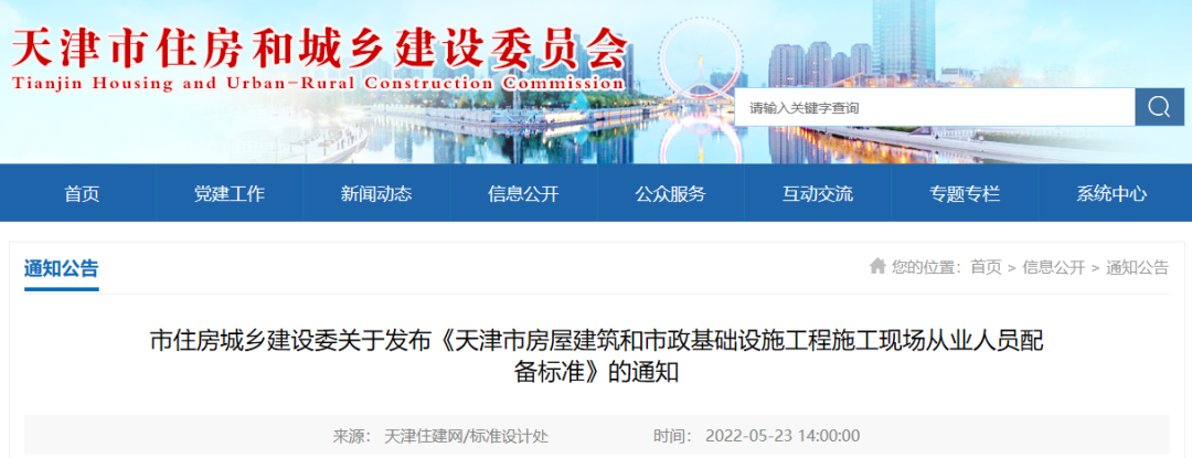 5月23日,天津市住房城乡建设委发布《天津市房屋建筑和市政基础设施工程施工现场从业人员配备标准》,自2022年9月1日起实施。