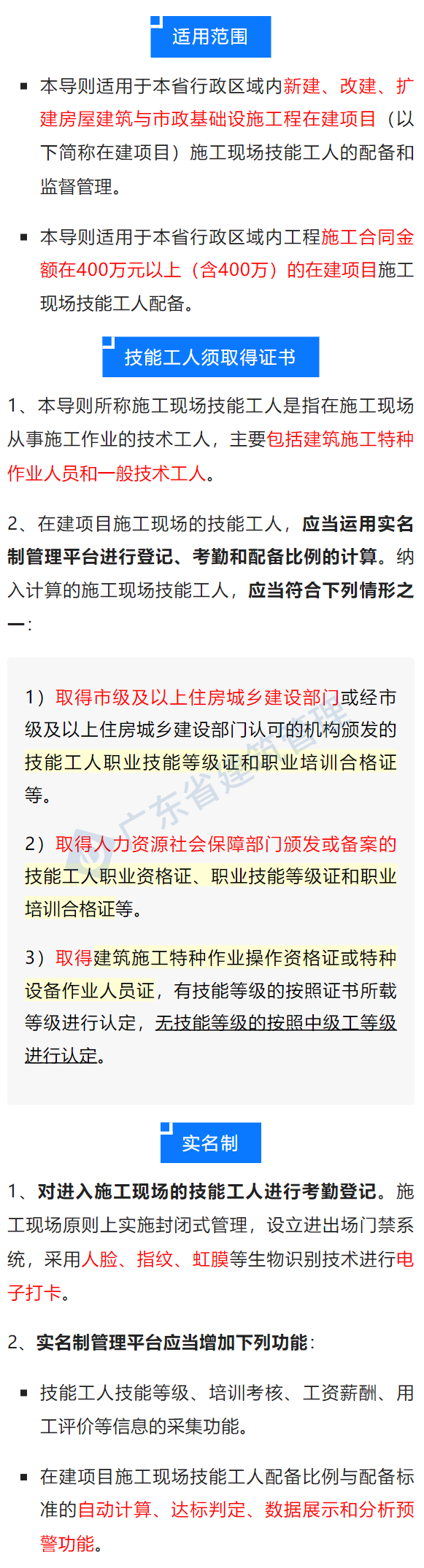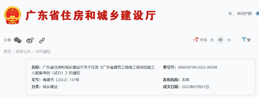 2022年7月5日,广东省住建厅发布关于印发《广东省建筑工程施工现场技能工人配备导则(试行)》的通知。