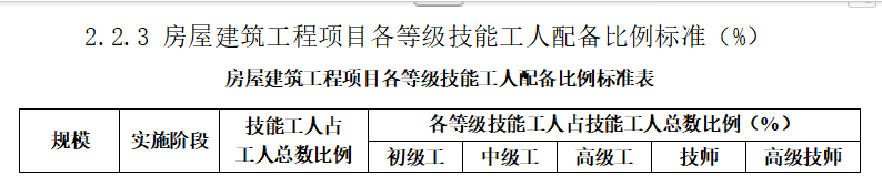 对于大型公共建筑、综合性工程以及工期较紧、多班施工作业的工程,应当在配备标准基础上适当增加技能工人数,提高中高等级工比例。