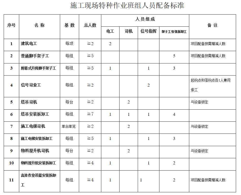 施工现场一般技术工人最低配备标准: