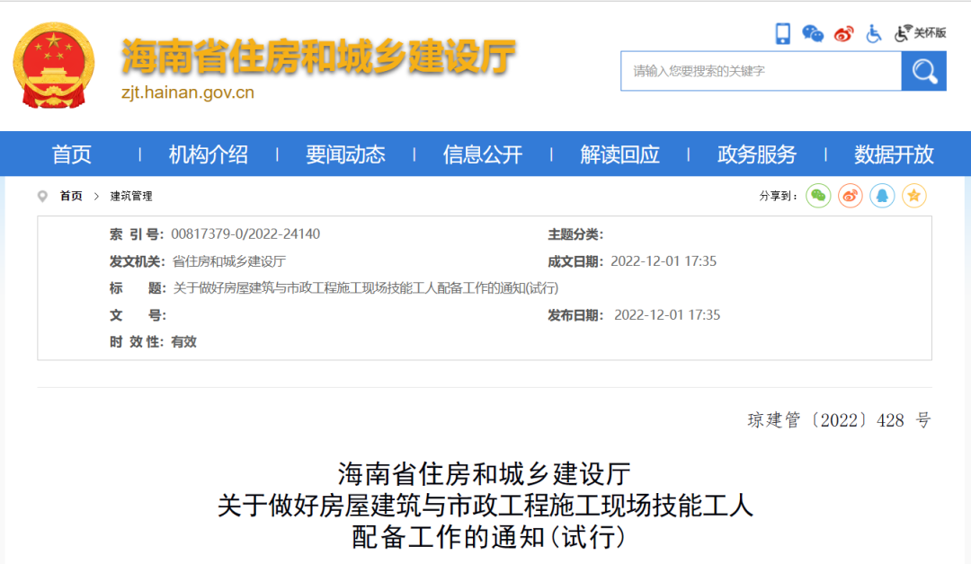 2022年12月1日,海南省住房和城乡建设厅发布《关于做好房屋建筑与市政工程施工现场技能工人配备工作的通知(试行)》,自2023年1月1日起试行,有效期3年。