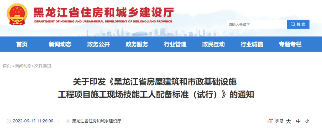 6月15日,黑龙江省住建厅发布关于印发《黑龙江省房屋建筑和市政基础设施工程项目施工现场技能工人配备标准(试行)》的通知。