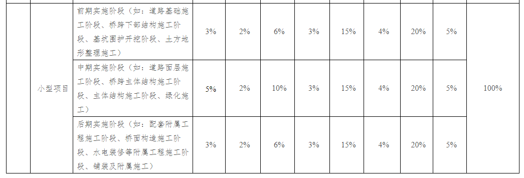 市政基础设施工程的日常监管参考标准:道路基础施工、桥跨下部结构施工、基坑围护开挖、土方地形整理施工等前期实施阶段达到配备标准总数的25%;道路面层施工、桥跨主体结构施工、主体结构施工、绿化施工等中期实施阶段累计达到配备标准总数的75%;配套附属工程施工、桥面构造施工、水电装修等附属工程施工、铺装及附属施工等后期实施阶段累计达到配备标准总数的100%。