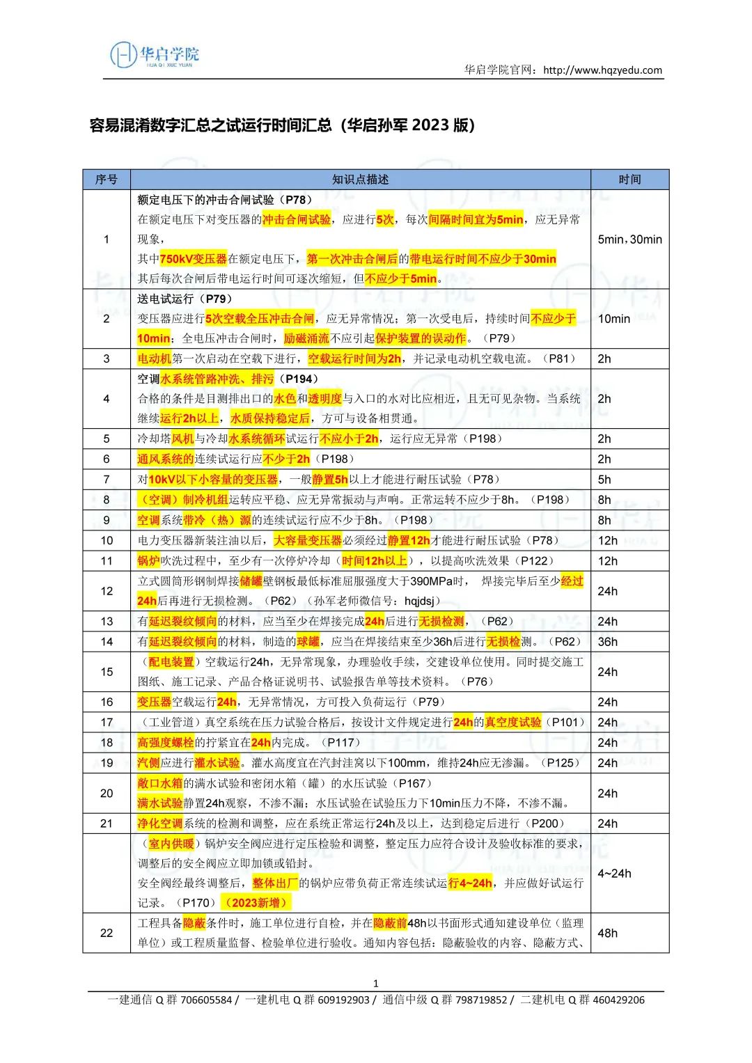 华启机电工程实务汇总22——容易混淆数字之试运行时间汇总(2023孙军版)20230831