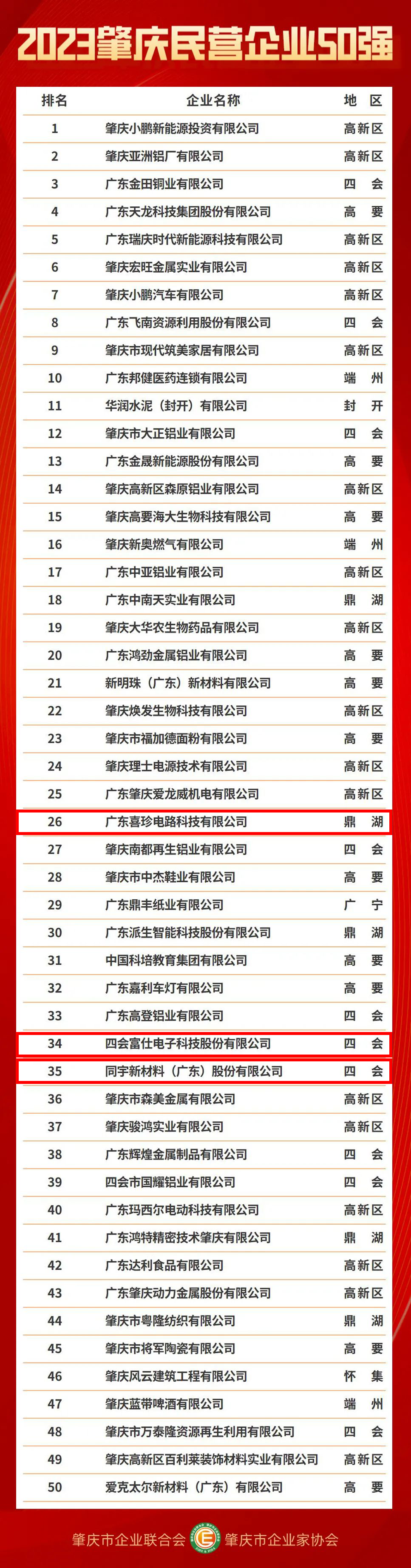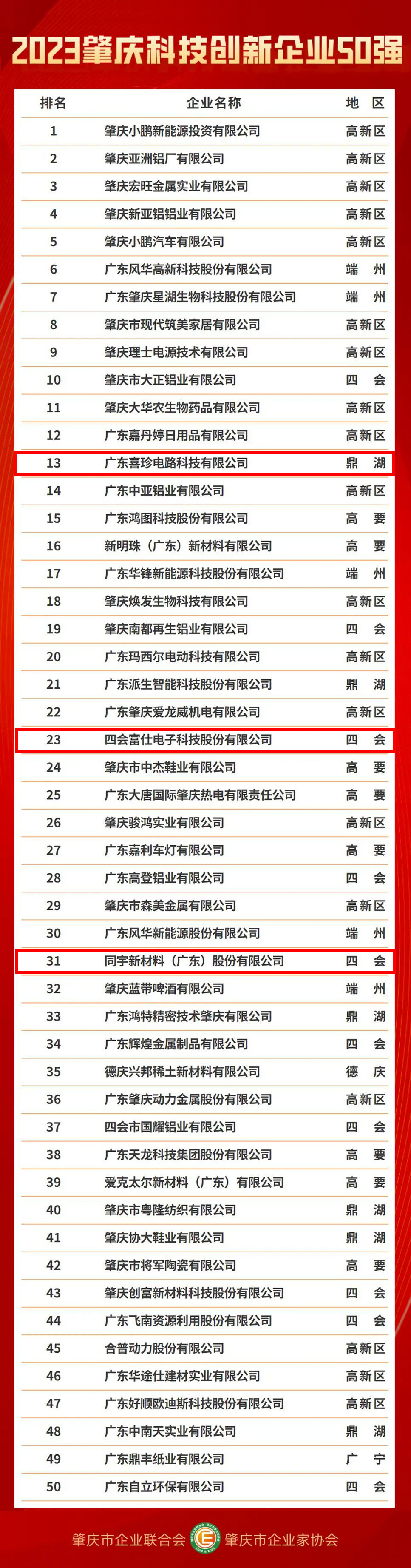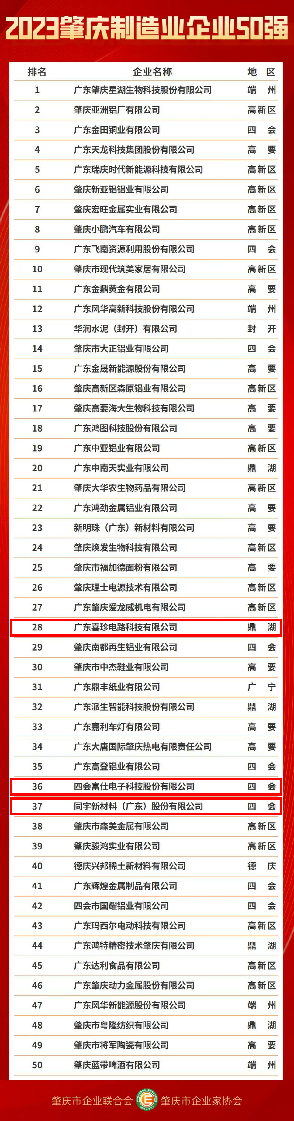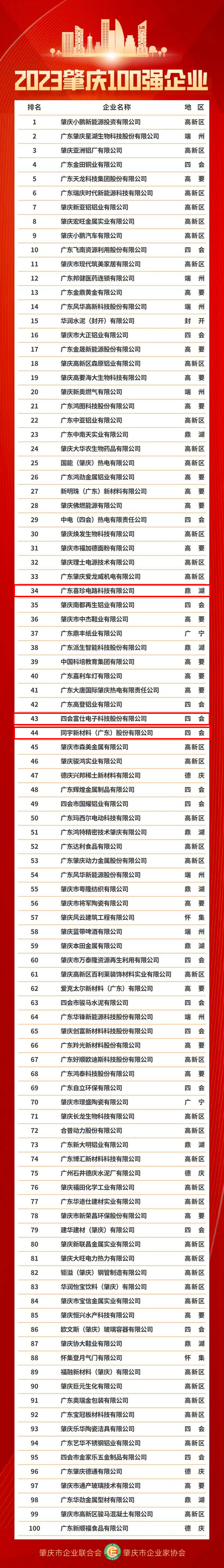 与您一路同行,做您最忠实的拥护者--PCB行业融合新媒体-2023年最有价值的电路板产业服务平台!欢迎您的关注与点赞!祝您事业有成!平安喜乐!8月25日,“2023肇庆企业100强”发布在广东省肇庆市举行,同期发布了民营企业50强、制造业企业50强和科技创新企业50强。其中,广东喜珍电路科技有限公司、四会富仕电子科技股份有限公司、同宇新材料(广东)股份有限公司四个榜单均在榜。据悉,这是肇庆市企业联合会、肇庆市企业家协会连续7年举办肇庆企业100强发布。