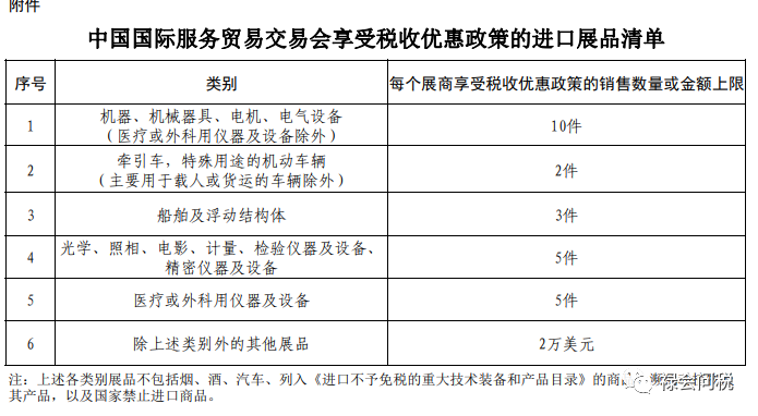 一、对服贸会每个展商在展期内销售的进口展品,按附件规定的数量或金额上限,免征进口关税、进口环节增值税和消费税。附件所列1-5类展品,每个展商享受税收优惠的销售数量不超过列表规定;其他展品,每个展商享受税收优惠的销售金额不超过2万美元。