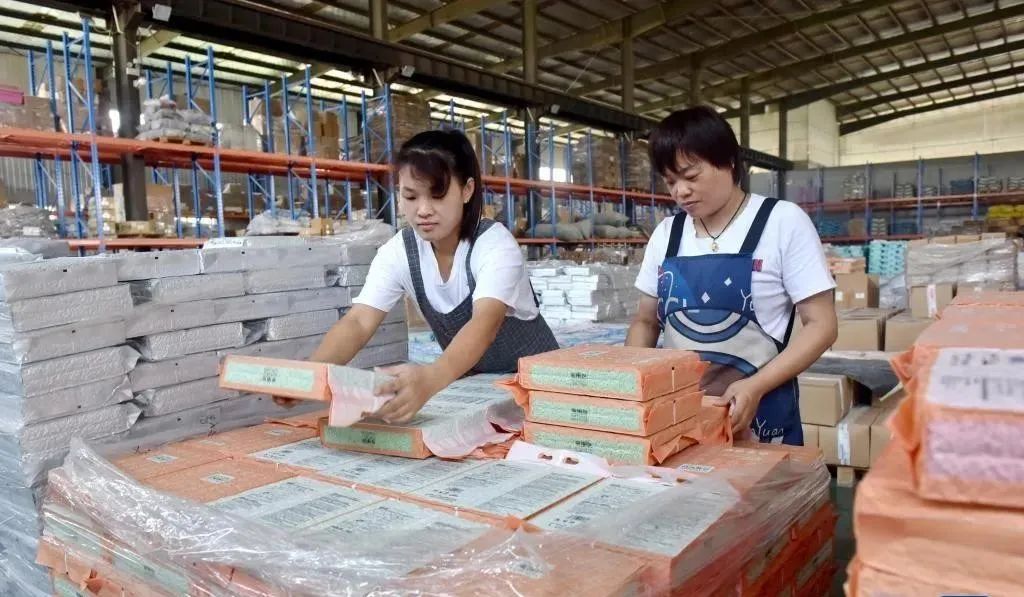 8月30日,河北省邢台市南和区和阳镇一家宠物用品电商企业工人在仓库打包产品,准备发货。
