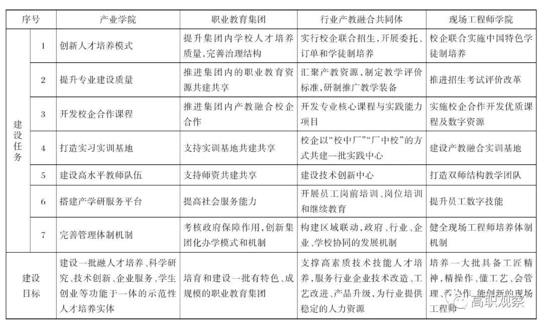 功能层面,国家在推动产业学院建设的同时,也在推动多种形式的产教融合模式与载体,如职业教育集团以及现场工程师学院等。多种模式与载体既存在联合多方资源、互通共享、协同育人的相似性,又在运作机制和主体功能上存在差异。其具体建设任务与建设目标对比如表1所示。