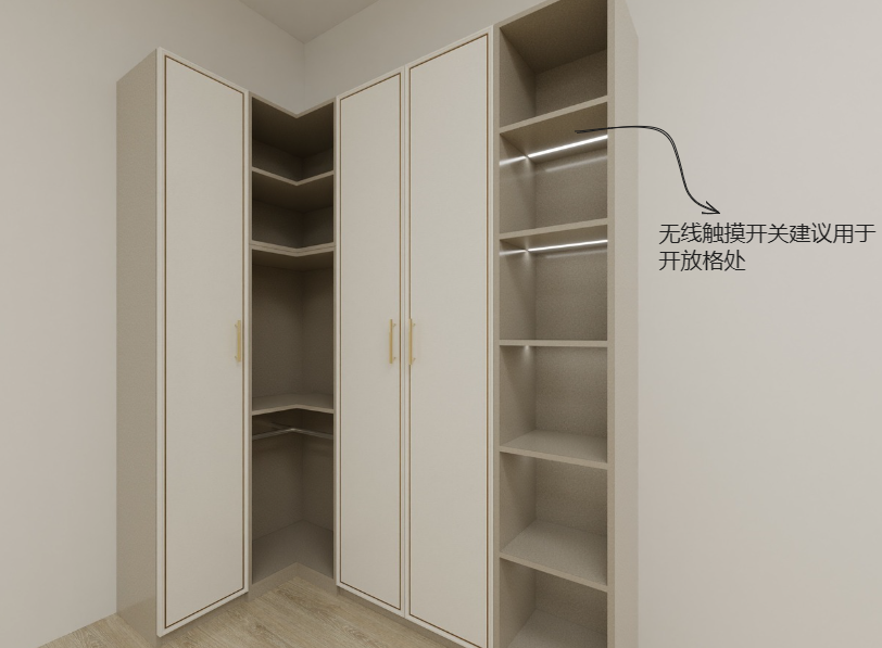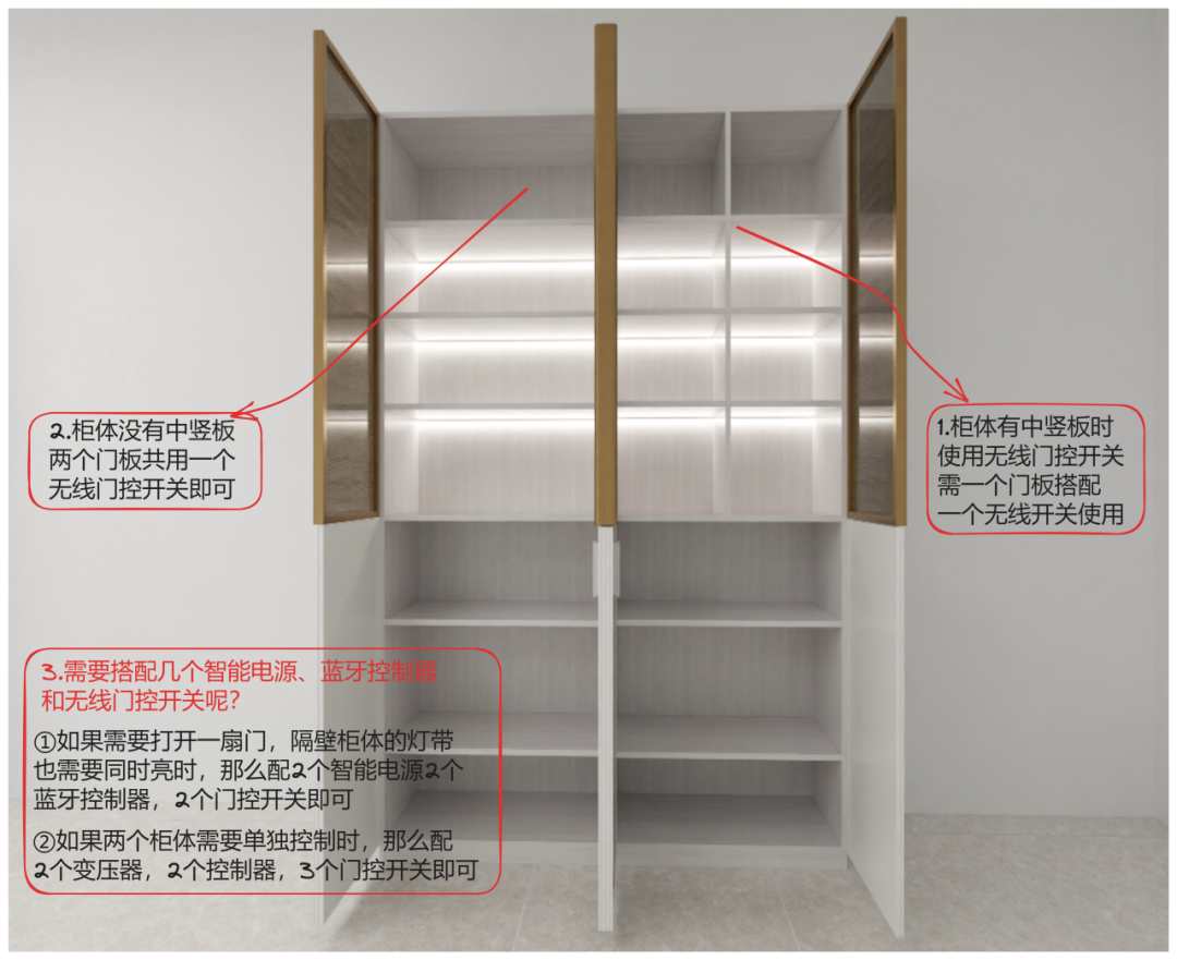 ③如柜体有门板,建议搭配无线门控开关使用,不建议搭配无线触摸开关使用。如需使用无线触摸开关,建议用于开放柜。原因:需要打开门使用触摸开关才可看到灯带亮,使用效果较差