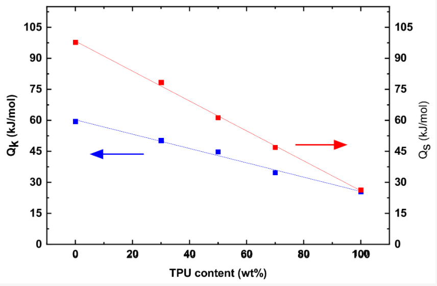 图8显示了Qs和Qk随TPU质量分数的变化。随着TPU质量分数的增加,Qs和Qk呈线性下降,表明PLA/TPU共混物的活化能可表示为: