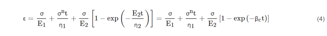 其中t为蠕变时间,βc=E2/η2。其中,E1和η1分别为弹簧1的弹性常数和非线性阻尼器1的粘性,E2和η2分别为弹簧2的弹性常数和线性阻尼器2的粘性,β−1c是非线性Burgers蠕变变形模型的特征时间。第一项代表瞬时弹性变形,第二项代表稳态蠕变,第三项对应瞬态蠕变变形。