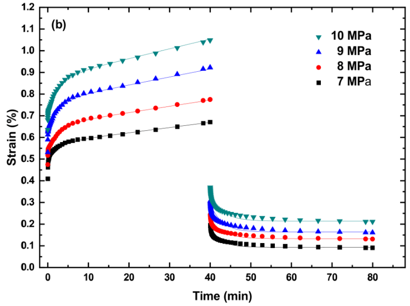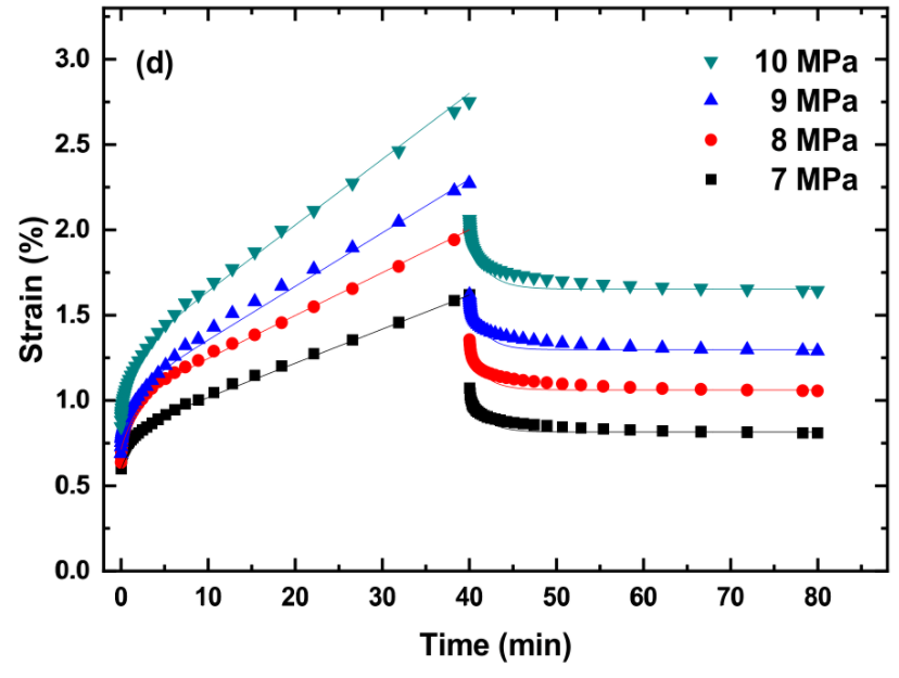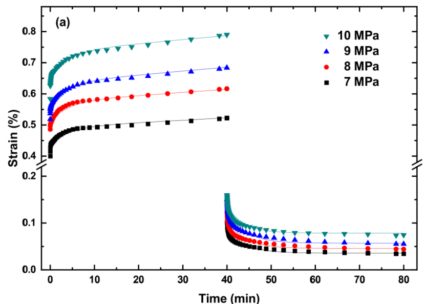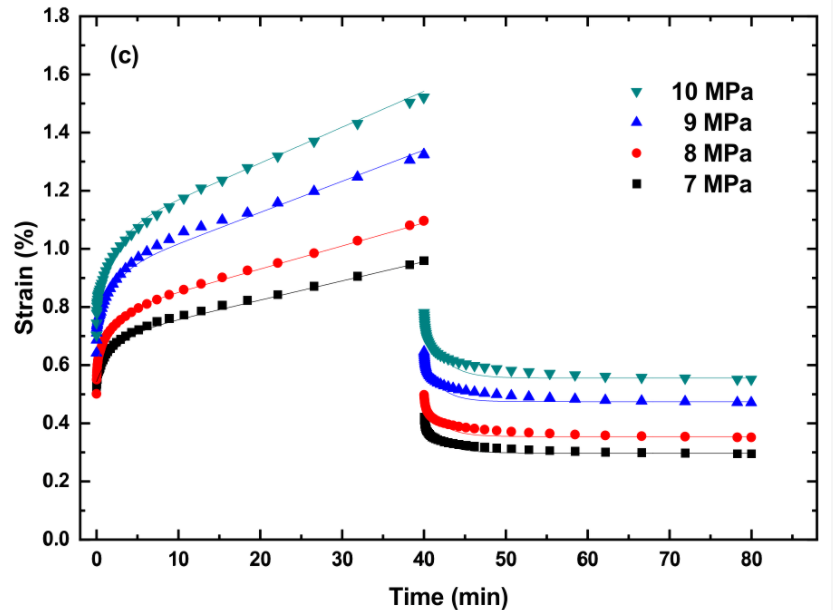 PLA、TPU和PLA/TPU共混物的蠕变测试是在动态机械分析仪(TA Q800 DMA,TA instrument,New Castle,DE,USA)上在10至40°C的温度范围内进行的。由于仪器的限制和材料性能的差异,施加在PLA、TPU和PLA/TPU共混物上的应力是不同的。在蠕变试验之前,每个试样在预设温度下保持5分钟以达到热平衡,蠕变试验的时间为40分钟。蠕变试验后,蠕变试样在无应力状态下保持40分钟,在测试过程中测量应变随时间的变化。