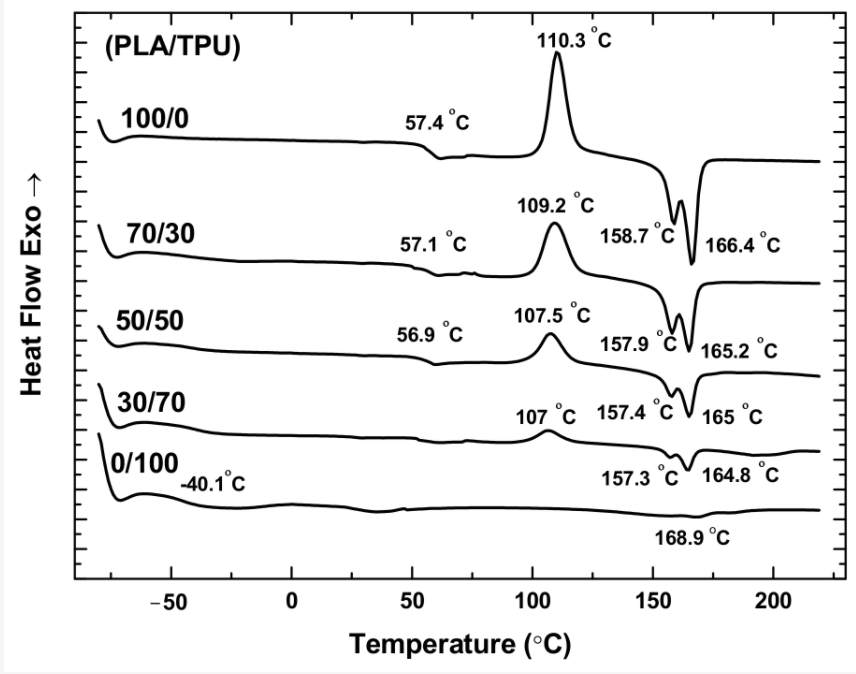 图2. PLA、TPU和PLA/TPU混合物的DSC曲线