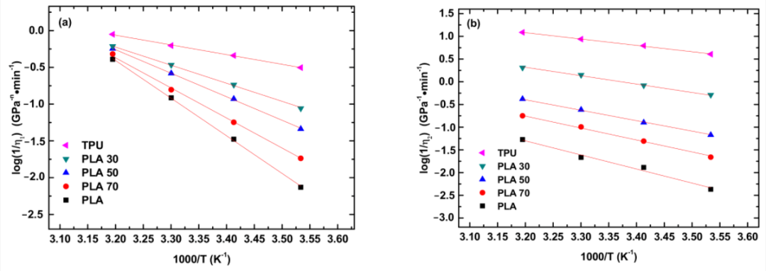 其中η10和η20是两个常数,Qs和Qk分别是稳态蠕变和瞬态蠕变速率过程的活化能,R是气体常数,T是绝对温度。图7显示了η1和η2的温度依赖性。很明显,η-11和η-12都是T-1的指数递减函数。使用等式(5)拟合图7a、b中的数据,我们获得了PLA、TPU和PLA/TPU共混物蠕变变形的活化能。