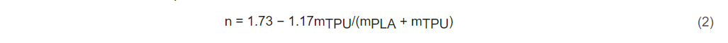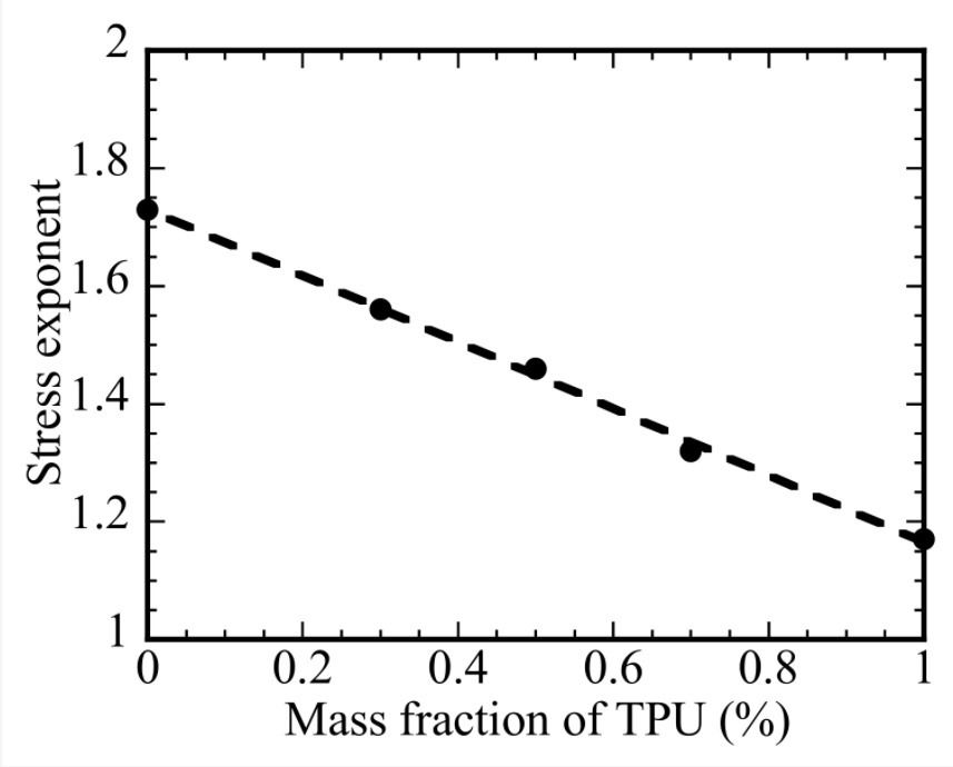 图5显示了应力指数随TPU质量分数的变化。应力指数从PLA的1.73线性下降到TPU的1.17。这种趋势表明,增加PLA/TPU共混物中TPU的比例会降低聚合物链运动的阻力。根据图5中的结果,应力指数对PLA/TPU共混物中TPU质量分数的依赖性可表示为: