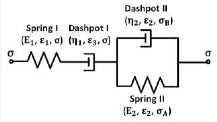 为了分析PLA、TPU和PLA/TPU混合物的蠕变变形以及稳态蠕变下应力和蠕变速率之间的幂律关系,我们引入了非线性Burgers模型的Kelvin示意图,如图6所示,其中阻尼器蠕变率的应力依赖性I遵循类似于方程式(1)的幂律关系,如下所示:
