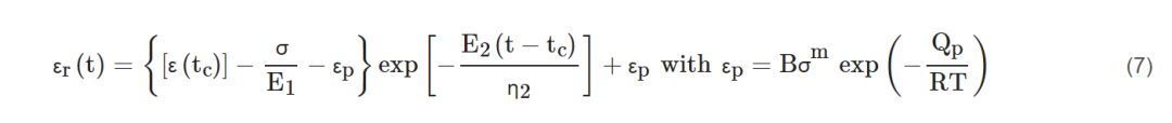 其他元素所经历的应变/应变率与相应的施加应力成正比。在恒定应力(蠕变变形)作用下,我们可以采用与线性Burgers模型的Kelvin示意图相同的方法来获得非线性Burgers模型的合成应变ε的时间依赖性,如下所示: