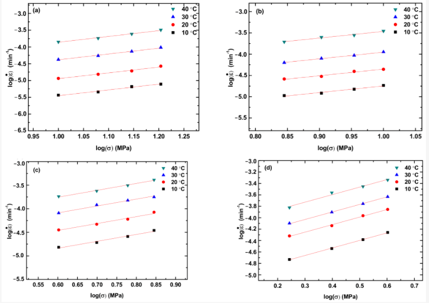 图4. 不同蠕变温度下,稳态蠕变情况下蠕变速率的应力依赖性:(a)PLA, (b) PLA/TPU共混物,PLA与TPU的比例为70:30 (c) PLA/TPU共混物,PLA与TPU的比例为50:50 (d)PLA/TPU共混物,PLA与TPU的比例为30:70