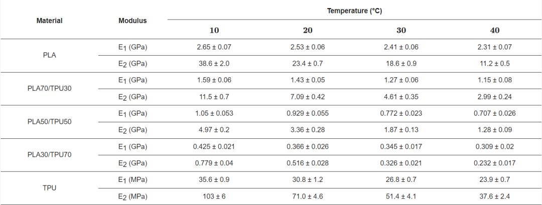 表1. PLA、TPU和PLA/TPU混合物的E1和E2的温度依赖性
