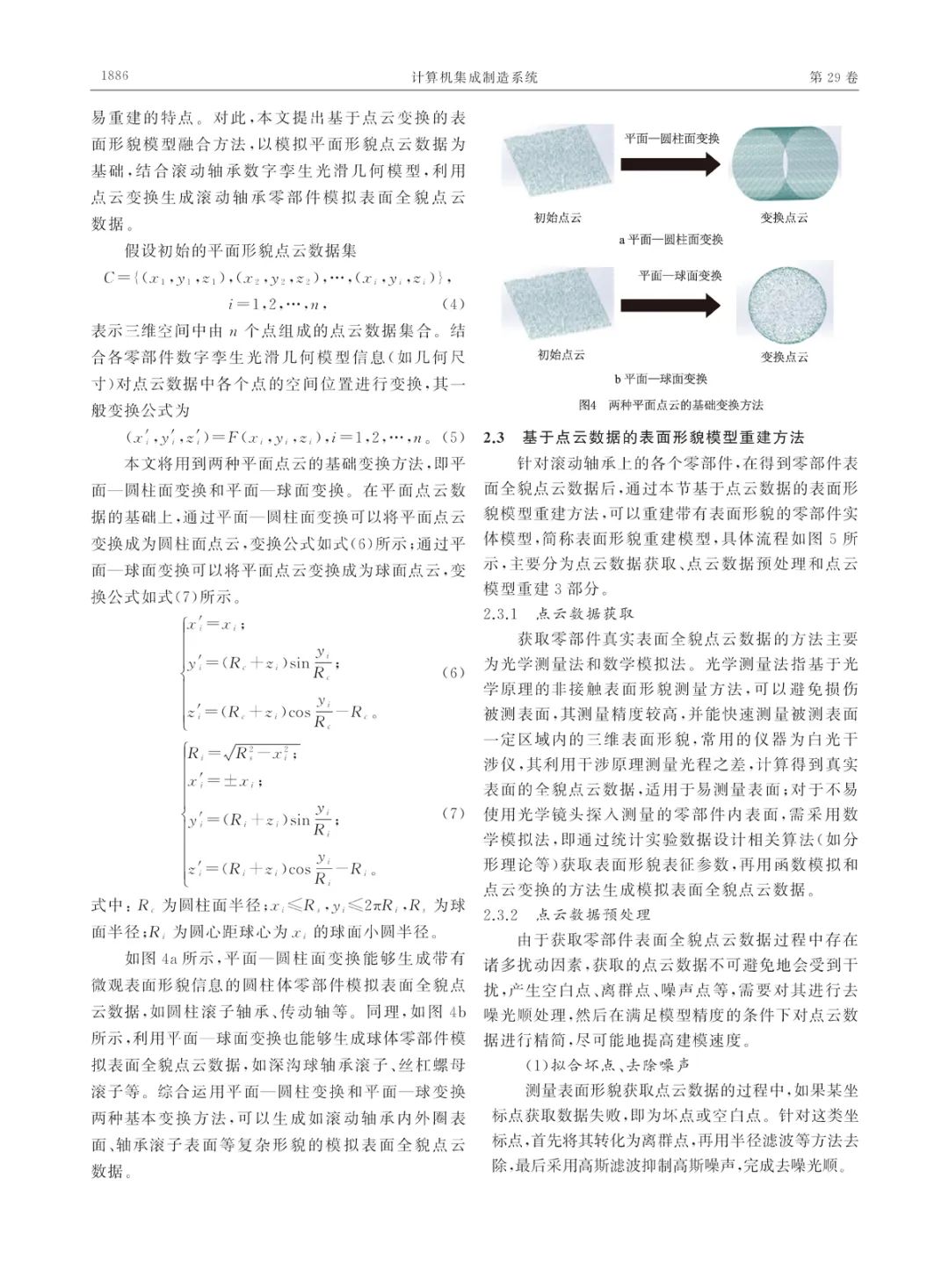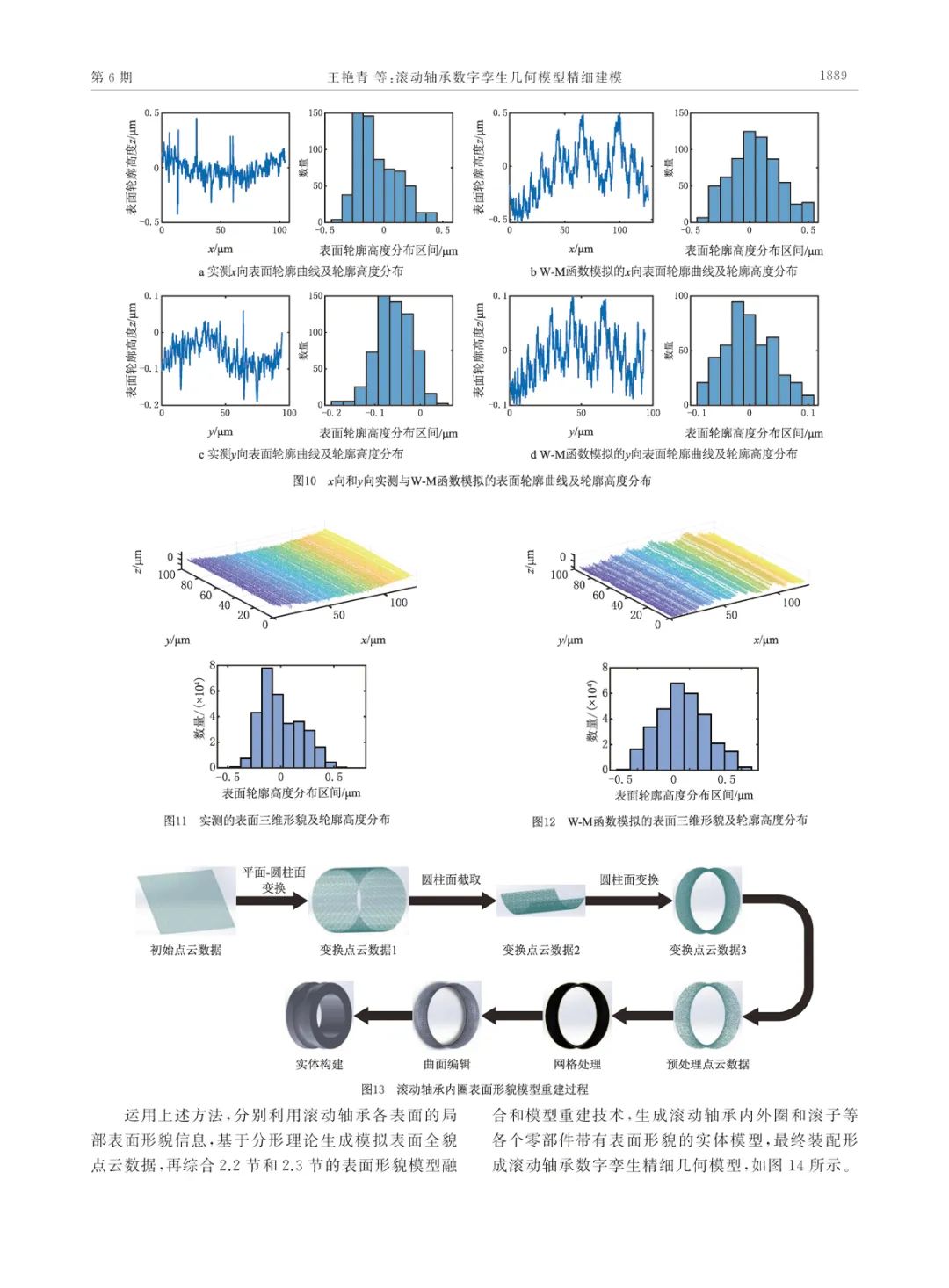 针对滚动轴承数字孪生几何模型构建过程中,因被赋予理想的光滑表面而缺乏表面形貌信息,导致模型配合面与物理实体一致性差的问题,本文提出滚动轴承数字孪生几何模型精细建模方法,基于分形理论、点云变换和点云重建技术构建了带有表面形貌特征的滚动轴承数字孪生精细几何模型。通过对滚动轴承的数字孪生精细几何模型和光滑几何模型进行仿真分析,并与实验采集的滚动轴承振动数据在时频域参数上进行对比验证,表明相比传统的光滑几何模型,滚动轴承的数字孪生精细几何模型更符合实际运行情况。