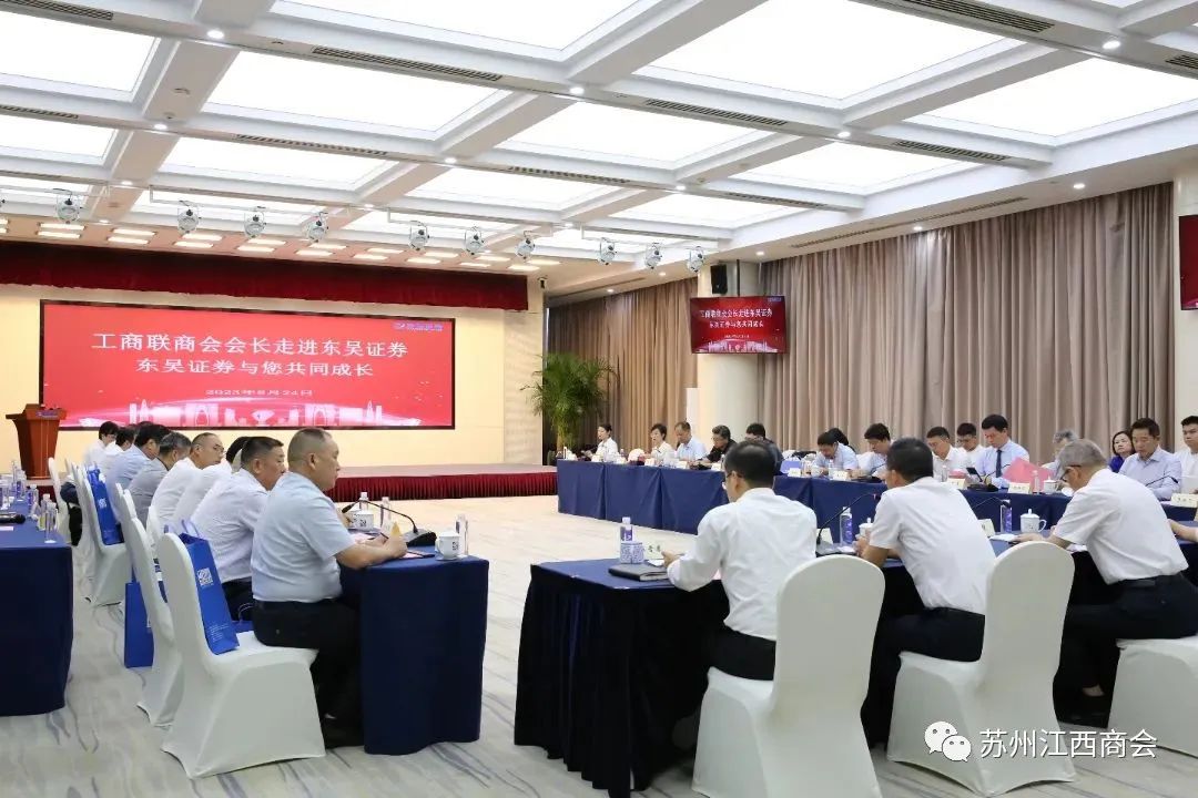苏州市工商联组织“商(协)会会长走进东吴证券”活动,苏州市江西商会会长杜康与全市17位商(协)会会长一起走进东吴证券座谈交流,详细了解了东吴证券的发展情况,听取了4位金融专家的精彩分享。苏州市政协副主席、市工商联主席周俊,东吴证券党委副书记、总裁薛臻,市工商联副主席吕瑾出席活动。