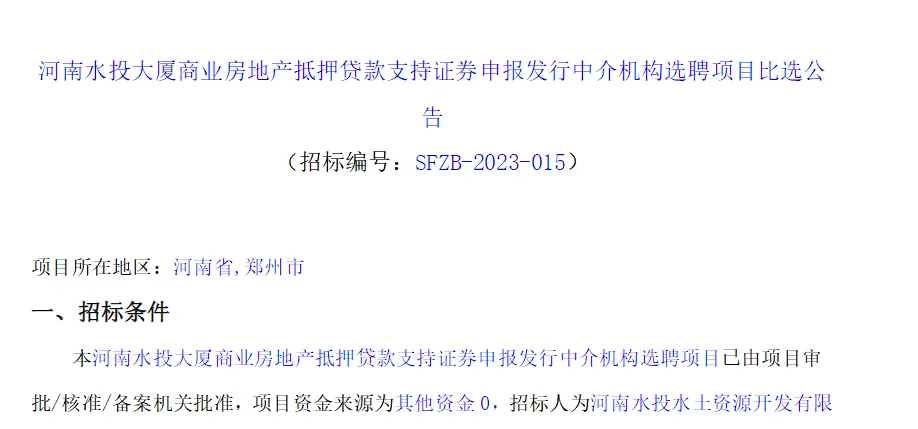 河南水投大厦商业房地产抵押贷款支持证券申报发行中介机构选聘项目比选公告