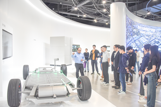 随后,支队来到了国鸿氢能科技产业园,参观了大功率氢燃料电池电堆生产及氢能商用车动力系统集成项目。在讲解参观中,支队成员现场学习了石墨板燃料电池电堆及系统等产品的技术原理,领略了新产品领先的性能。项目地的负责人员还向支队成员展示了产品在商用重卡中的应用。通过在国鸿氢能的参访,支队成员更加深入地了解到零碳产业园中氢燃料电池及绿氢设备制造产业链的发展情况,以及园区为实现“双碳”目标贡献的力量。