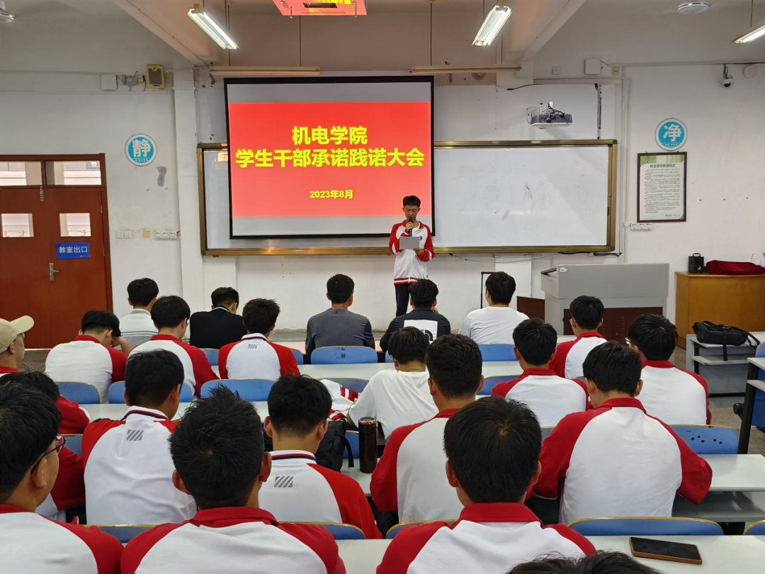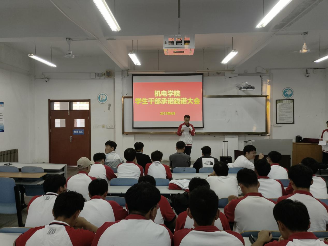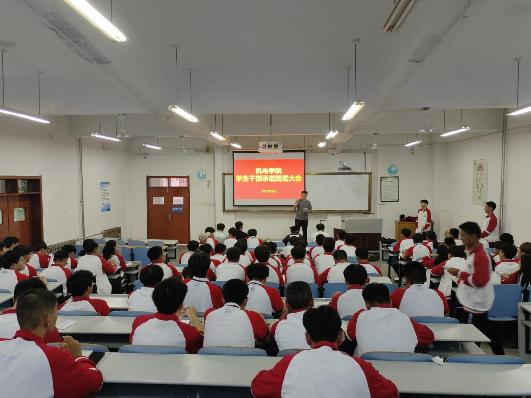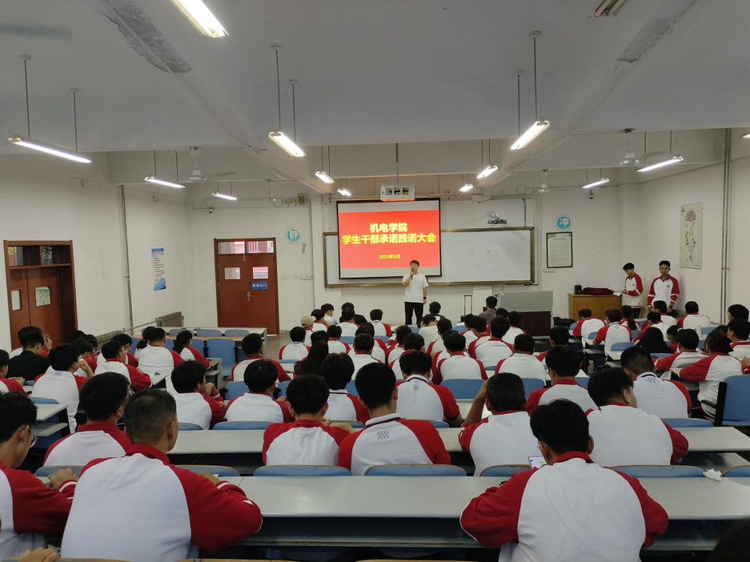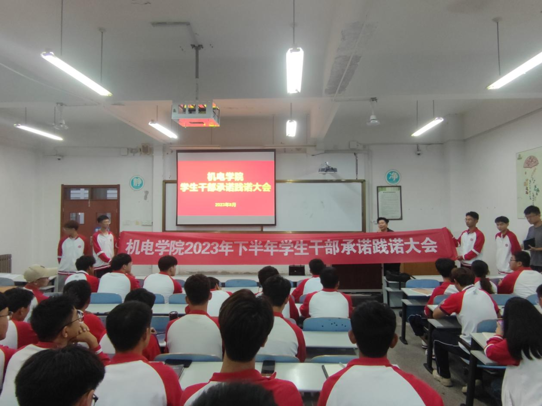 为进一步加强和改进团学干部作风建设,机电学院在智造楼106举行2023年下半年学生干部承诺践诺大会。出席本次会议的成员有机电学院学工办兰茂龙老师、李海洋老师、宫明乐老师、张浩杰老师、第十九届学生会主席、实习生以及各班学生干部。