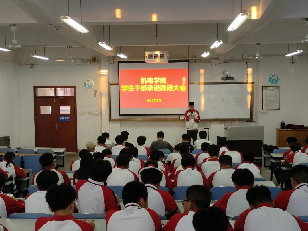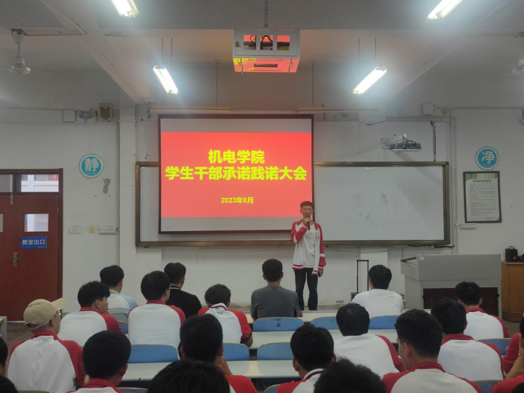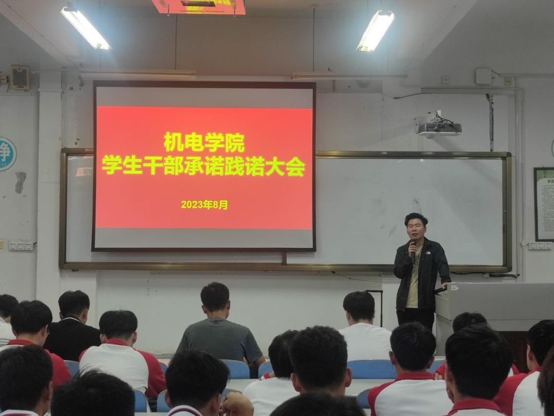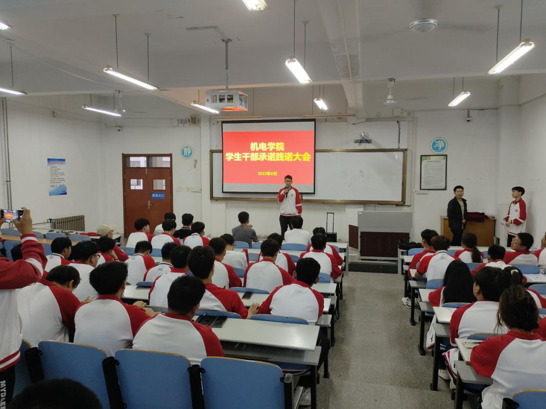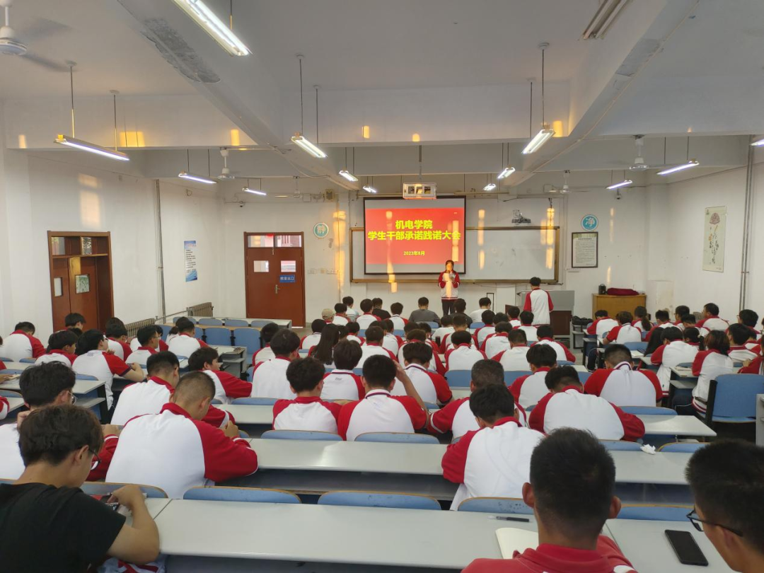 为进一步加强和改进团学干部作风建设,机电学院在智造楼106举行2023年下半年学生干部承诺践诺大会。出席本次会议的成员有机电学院学工办兰茂龙老师、李海洋老师、宫明乐老师、张浩杰老师、第十九届学生会主席、实习生以及各班学生干部。