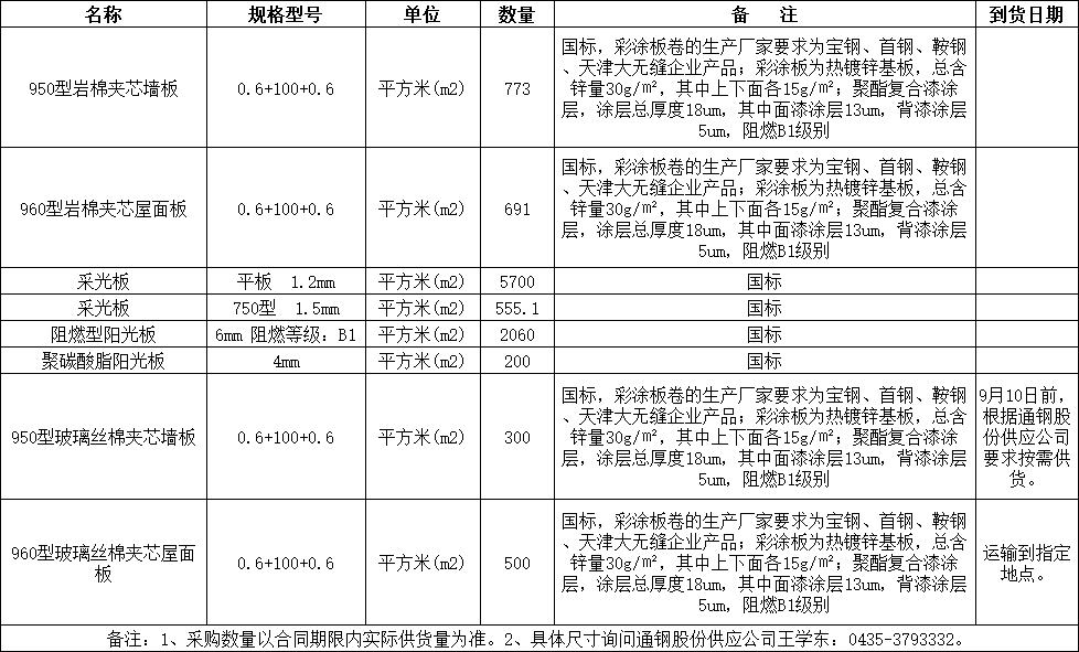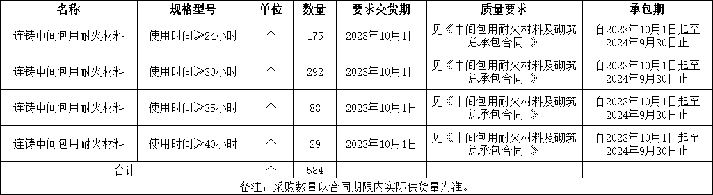 一、原连铸中间包用耐火材料更名为连铸中间包用耐火材料总包。二、报价方式:竞拍者在规定时间内不限次数反向竞拍,最终成交价包含所有运输费用,为一票含税到厂价格。三、合同签订及供货时限:供应商中标后需在5个工作日内与首钢水钢签订合同。签订后,按首钢水钢通知组织发货并确保按合同要求的交货时间内到货。未按时限要求办理合同签订及供货视为违约,违约行为将扣除全部保证金、取消开户资格。四、付款日期及方式:中标供应商根据结算证明,并收到出卖人增值税专用发票后分期支付。五、收货单位:中标供应商自办汽车运输或铁路运输到首钢水城钢铁(集团)有限责任公司,铁路运输到站:成都局水城站,专用线名称:首钢水城钢铁(集团)有限责任公司专用铁路。六、代理服务费收取:供应商在中标后两个工作日内向首钢股份公司迁安钢铁公司缴纳代理服务费,收费标准详见标书,开增值税专用发票。如未按规定时限缴纳代理服务费视为违约,首钢迁钢及首钢水钢有权扣除供应商全部保证金,并取消平台开户资格,终止本标交易。七、对平台规则和注册信息有疑问,联系人:王东星,电话:0315-7708931,招标疑问,联系人:刘健,电话:0858-8142812,合同签订以及其他疑问,联系人:赵金恒,电话:0858-8143519。特别提醒:2023年9月1日下午招采第五标连铸中间包用耐火材料、第六标轧线非标备件取消采购招标。