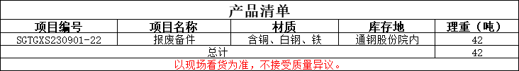 特别说明:该批物料是能源事业部制氧作业区淘汰下来的报废备件。材质含铜、白钢、铁。客户中标后两个工作日内签订合同,签订合同后两个工作日内付全部货款,多退少补,逾期回款视为弃标,签订合同后7个工作日内提货完毕。以上未按要求办理按违约处理。通钢股份对竞拍销售的报废备件的质量及数量不做保证。报废备件具体情况以现场实物看货为准,要求客户必须现场看货。以上所有报废备件重量属估算值,实际成交以通钢股份检斤重量为准。同时客户接到现场通知后应立即组织提货,不得因延迟提货影响通钢股份生产,严禁超载运输,中标客户自行承担运输车辆及装卸费用。业务联系人:王国富,电话:18943571998,提货地址:通钢股份院内。