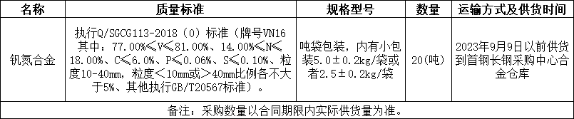 1、报价方式:竞拍者在规定时间内不限次数反向竞拍,最终成交价包含所有运输费用,为一票含税到库价格。2、合同签订及到货时限:供应商中标后需在3日内与首钢长钢签订《工矿产品买卖合同》(省外供应商可传真签订);合同签订后中标供应商按首钢长钢采购中心通知组织发货。严格执行合同约定交货期限,如逾期交货,交货时市场价格上涨,执行原合同价格;交货时市场下跌,执行全球铁合金网公布的合金成交指导价格当日承兑含税成交价最低价格。若因逾期到货影响首钢长钢生产,由此产生的一切损失由中标供应商承担。3、未按时限要求办理合同签订及组织发货视为违约,违约行为分别按照招标公告及《工矿产品买卖合同》约定条款进行处罚,同时其在平台上的投标保证金不予退还,中标供应商还应对首钢长钢赔偿总货款额10%的违约保证金。本合同在履约过程中发生争议,应以协商解决为第一选择,协商不成任何一方均可向买受人住所地有管辖权的人民法院提起诉讼,凡发生因诉讼而由买受人承担的诉讼费、鉴定费、律师费、执行费等其他费用均由供应商全额承担(买受人可凭相关票据、材料、文书等从应付出卖人的款项中直接扣除)。4、付款日期及方式:中标供应商按买受人财务要求办理挂账手续后,30个自然日内以银行(电子)承兑的方式支付,货款支付均不计利息。5、收货单位:首钢长治钢铁有限公司采购中心(合金仓库)。6、代理服务费:供应商在中标后两个工作日内向首钢股份公司迁安钢铁公司缴纳代理服务费,收费标准详见标书,开增值税专用发票。未按规定时限缴纳代理服务费,扣除全部投标保证金,并取消开户资格。7、对平台规则和注册信息有疑问,联系人:李朝,电话:13931438889。1、V77.00%-81.00%,当V≥77.00%合格,73.00%≤V<77.00%,每降低0.01%扣量0.15公斤/吨;70.00%≤V<73.00%,每降低0.01%扣量0.18公斤/吨;67.00%≤V<70.00%,每降低0.01%扣量0.30公斤/吨;V<67.00%时拒付。2、N,14.0%≤N≤18.0%合格,18.0%<N≤20.0%,每升高0.1%扣量1公斤/吨,当N<14.0%时,退货,当N>20%时,退货。3、C≤6.0%,当6.0%<C≤10.0%,每超0.1%,扣量0.5公斤/吨;当C>10.0%,每超0.1%,扣量1公斤/吨。4、P≤0.06%,0.06%<P≤0.20%,每超0.01%,扣量0.5公斤/吨;P>0.20%,每超0.01%,扣量3公斤/吨。5、S≤0.10%,0.10%<S≤0.25%,每超0.01%,扣量0.5公斤/吨;S>0.25%,每超0.01%,扣量3公斤/吨。1、按检验批次扣罚,扣罚以技术条件为基准进行扣罚。3、粒度<10mm或>40mm比例各不大于5%,目测超出部分由质量监督站组织相关单位共同确认后,并按批次直接扣除相应重量的2倍。4、若在检验过程中发现非钒氮合金的固态杂质时,按对应批量杂质所占比例的5倍直接扣除。5、包装物的供应与回收:汽车运输需加盖篷布。产品必须保证干燥。包装要求:外包装为吨袋包装,注明产品名称及生产厂家。结算时由买受人相关人员扣除包装重量,包装物不计价,供应商不回收,买受人回收。6、钒氮合金为贵金属,为了不产生争议,待化验结果合格后才可使用。7、竞拍者应认真阅读此文件中的各条款,充分了解竞拍采购所有标准及要求。8、中标供应商必须严格执行首钢迁钢及首钢长钢各项管理规定。采购公司:通钢股份