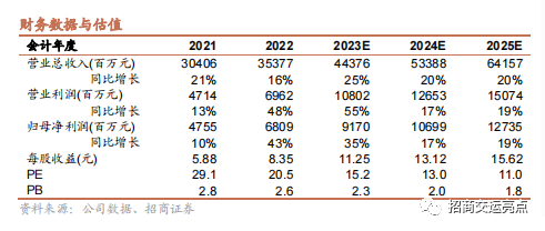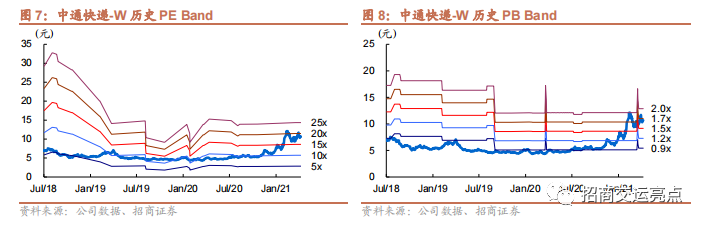 在加盟快递同质化竞争中,中通在产能投入和加盟网络管理的前瞻性战略举措为公司带来成本+网络+资金三重壁垒,企业护城河稳固,持续秉持量、质、利平衡发展理念。伴随行业进入存量竞争阶段,龙头分化加剧,中通的扩张对利润压力更小,鉴于公司龙头地位稳固的同时市占率有望持续扩大,我们上调盈利预测,预计2023-2025年公司归母净利润分别为91.7/107.0/127.4亿元,同比增长35%/17%/19%,对应23年PE为15.2x,PB为2.3x。维持“强烈推荐”评级。