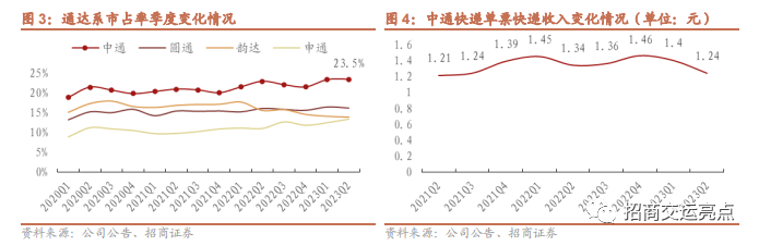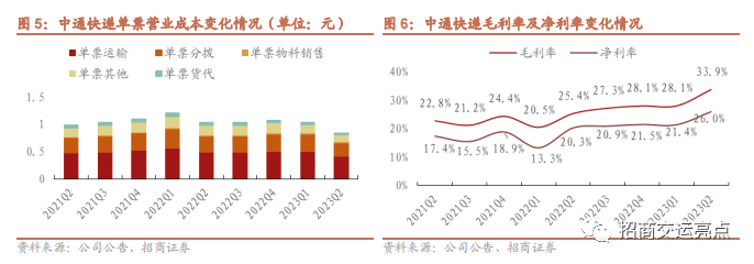 ❑龙头优势持续凸显,无惧价格下行Q2利润强势增长。中通加盟网络运营底盘扎实,持续发挥量—本—利正向循环,彰显规模及成本优势,从分项成本来看,Q2单票运输成本为0.42元,同比下降7分,高运力车辆同比增加50辆,装载效率进一步提升,单票分拨成本为0.25元,同比下降5分,转运中心自动化水平持续优化,自动分拣设备同比增加29套,综合多项成本管控举措,单票核心运营成本合计下降超15%。规模及成本优势下,公司无惧行业价格下行影响,Q2毛利率达到33.9%,同比/环比提升8.5pcts/5.8pcts,Q2单票调后净利润达到0.33元,同比/环比分别+0.05元/+0.03元,盈利水平强势增长。费用方面,Q2销售管理费用率稳定在5%左右,资本开支为22亿元,环比小幅下降4%。