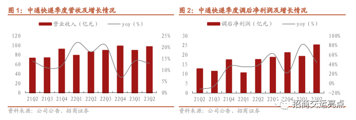 中通快递发布2023年半年度经营业绩,23H1实现营业收入187.2亿元,同比增长13.1%,实现调后净利润44.7亿元,同比增长54.6%;其中Q2实现营业收入97.4亿元,同比增长12.5%,实现调后净利润25.3亿元,同比增长43.9%。