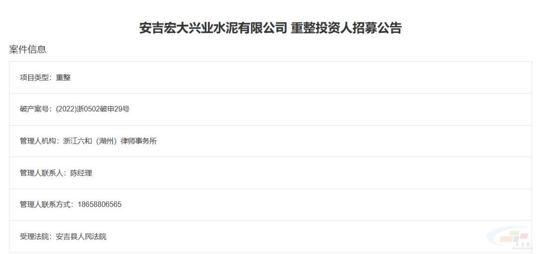 近日,中国水泥网从某资产交易平台获悉,安吉宏大兴业水泥有限公司重整投资人招募。招募公告显示,2022年12月12日,安吉县人民法院依法受理安吉宏大兴业水泥有限公司(以下简称“宏大公司”或“债务人”)破产清算一案【案号:(2022)浙0502破申29号】,并于2022年12月19日指定浙江六和(湖州)律师事务所担任安吉宏大兴业水泥有限公司管理人(以下简称“管理人”)。