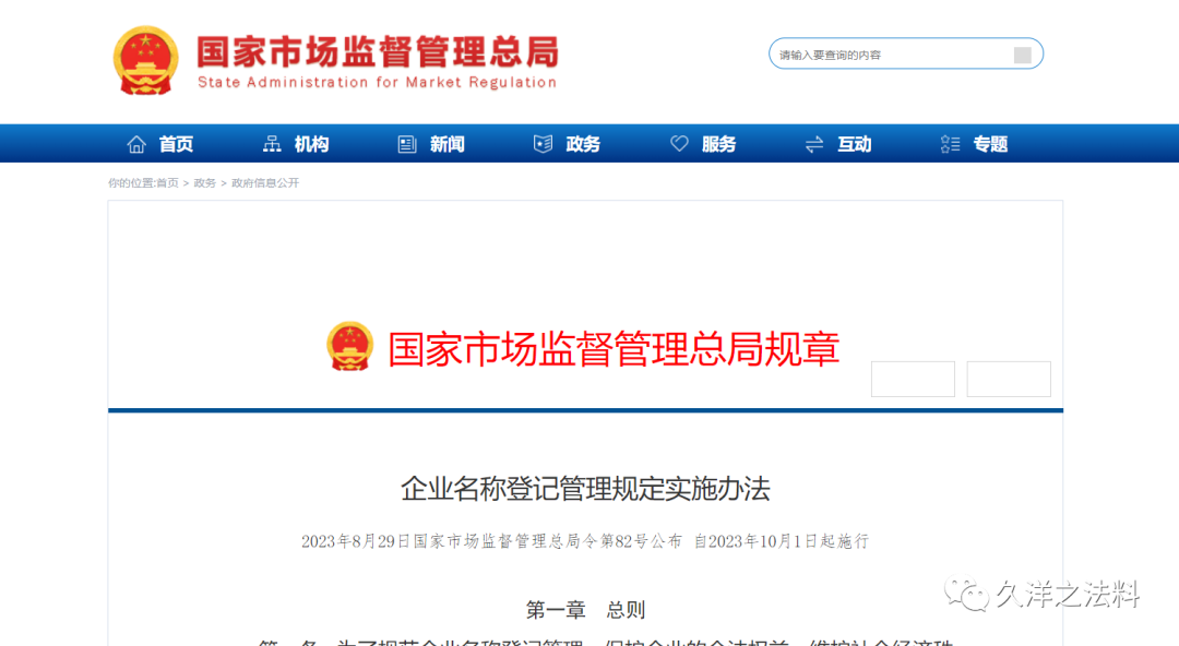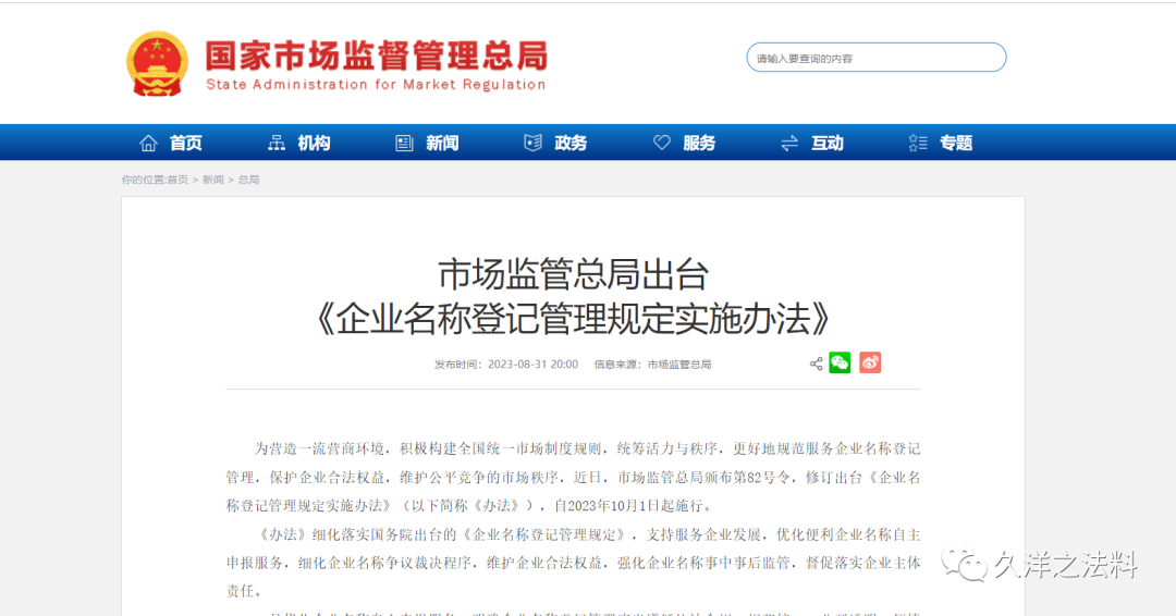 为营造一流营商环境,积极构建全国统一市场制度规则,统筹活力与秩序,更好地规范服务企业名称登记管理,保护企业合法权益,维护公平竞争的市场秩序,近日,市场监管总局颁布第82号令,修订出台《企业名称登记管理规定实施办法》(以下简称《办法》),自2023年10月1日起施行。