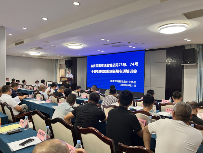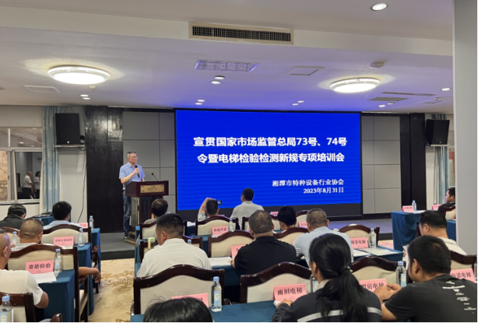 8月31日上午,湘潭市特种设备行业协会在华都大酒店组织举办了国家市场监管总局73号、74号令宣贯暨电梯检验检测新规专项培训会,来自全市67家电梯制造、安装和修理的企业共90余人参加了本次培训。