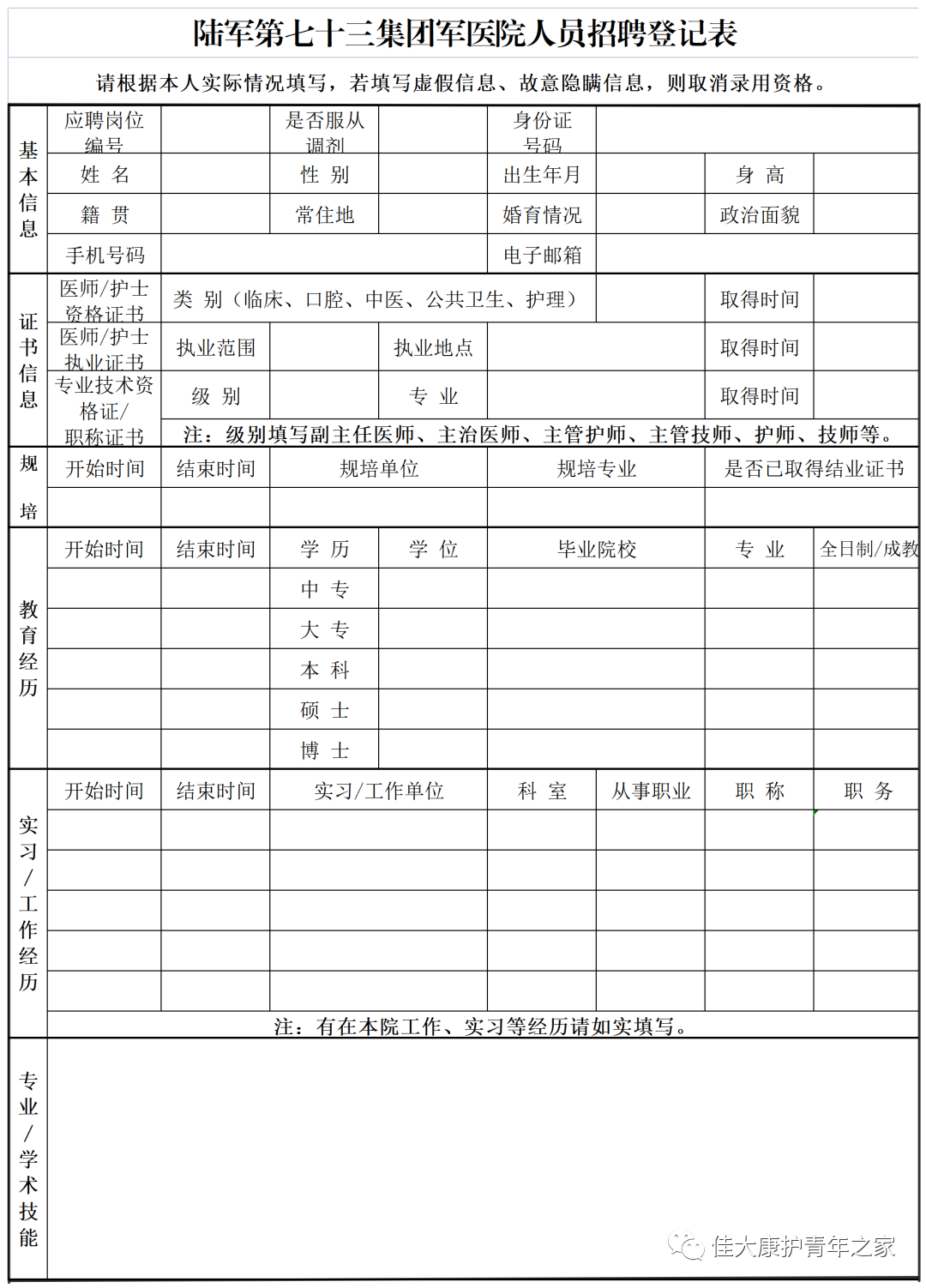 1.《陆军第七十三集团军医院招聘登记表》(附件2),下载填写后发送电子版至招聘邮箱,请勿变动表格或转换为图片、pdf等格式,文件名以“岗位编号+姓名”命名;