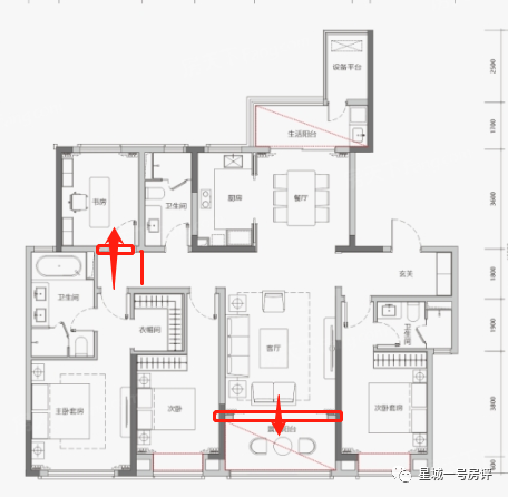 1、户型总体规整,但未有创新,基本是在传统143构型上深化而来;