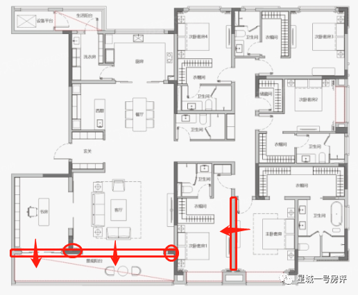 1、客餐厅,中西厨,洗衣房,晾晒阳台,书房这一整条流线的布置,都比较合理,也基本复核豪宅的构型,唯一缺乏的是保姆间这个功能空间;
