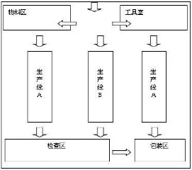 物料、在制品、产品和人员流动较多的部门或设备应该相邻,如下图所示。