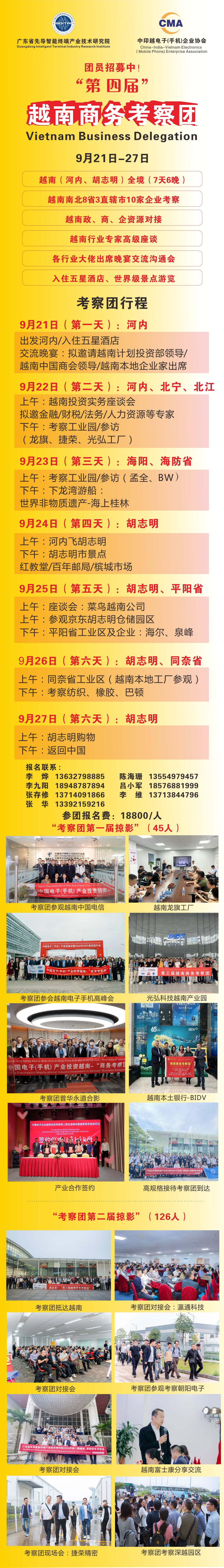 本次考察团由广东省先导智能终端产业技术研究院(GDITRI)、深圳市企业创新发展促进会智能终端委员会联合中印越电子(手机)企业协会(CMA)等共同组织,将在2023年9月21日至9月27日期间,前往越南多地,横跨越南8省3直辖市10家企业考察与对接会,将走进龙旗、捷荣、光弘、孟全、BW、海尔、泉峰、橡胶、巴顿、纺织、菜鸟、京东等企业和对接,行程涉及越南(河内、胡志明)全境等地(具体以实际行程为准),实地考察投资贸易环境,拓展商务市场资源。