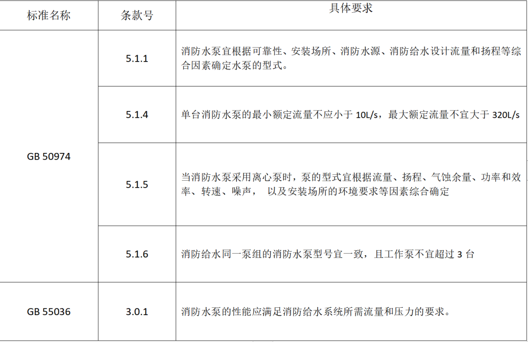 关于消防泵配置台数、泵型及性能参数的要求,在标准GB 50974和强制性国标GB 55036中有相应规定。详见表2。